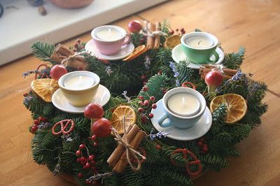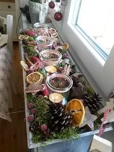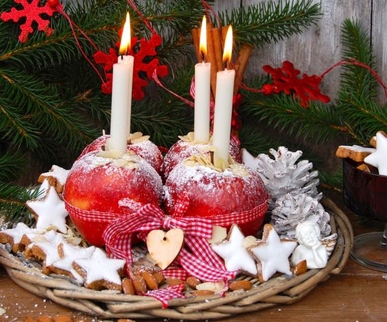 – des décorations naturelles (pommes de pins, rondelles d’orange séchées, flocons de neiges, batons de cannelle, anis étoilés, baies rouges, étoiles…. )