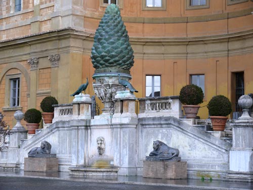 On s’attendrait plutôt à trouver dans cette cours du Vatican, une Statue de Saint ou une représentation de la Vierge…. Alors pourquoi cette représentation monumentale (4 m de hauteur) d’une pomme de pin entre 2 paons ?!?!