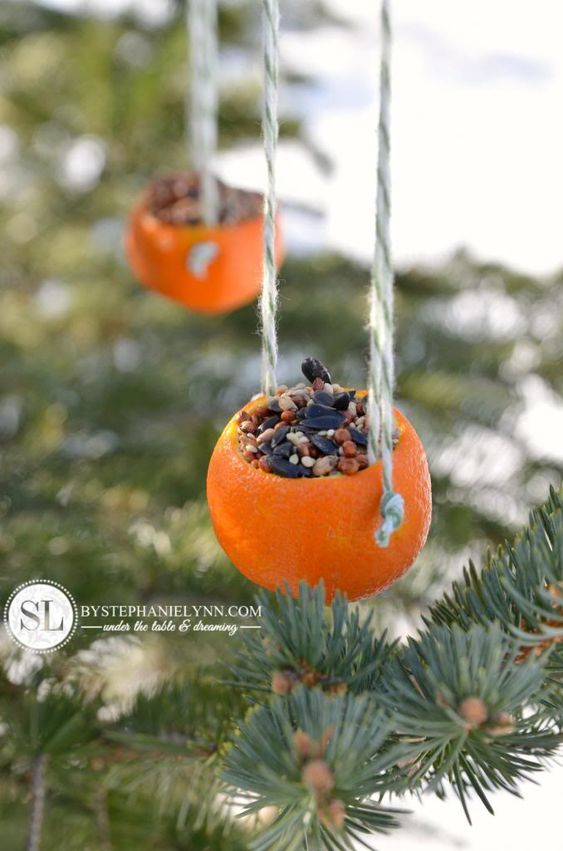 – Puis remplissez chaque demi-peau d’orange et laissez refroidir complètement avant de les suspendre dans les arbres du jardin ou de les disposez sur votre balcon (vous pouvez également placer une boule toute faite achetée dans le commerce dont vous aurez enlevé le filet)